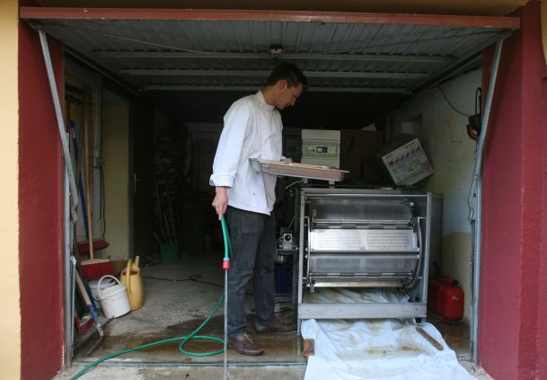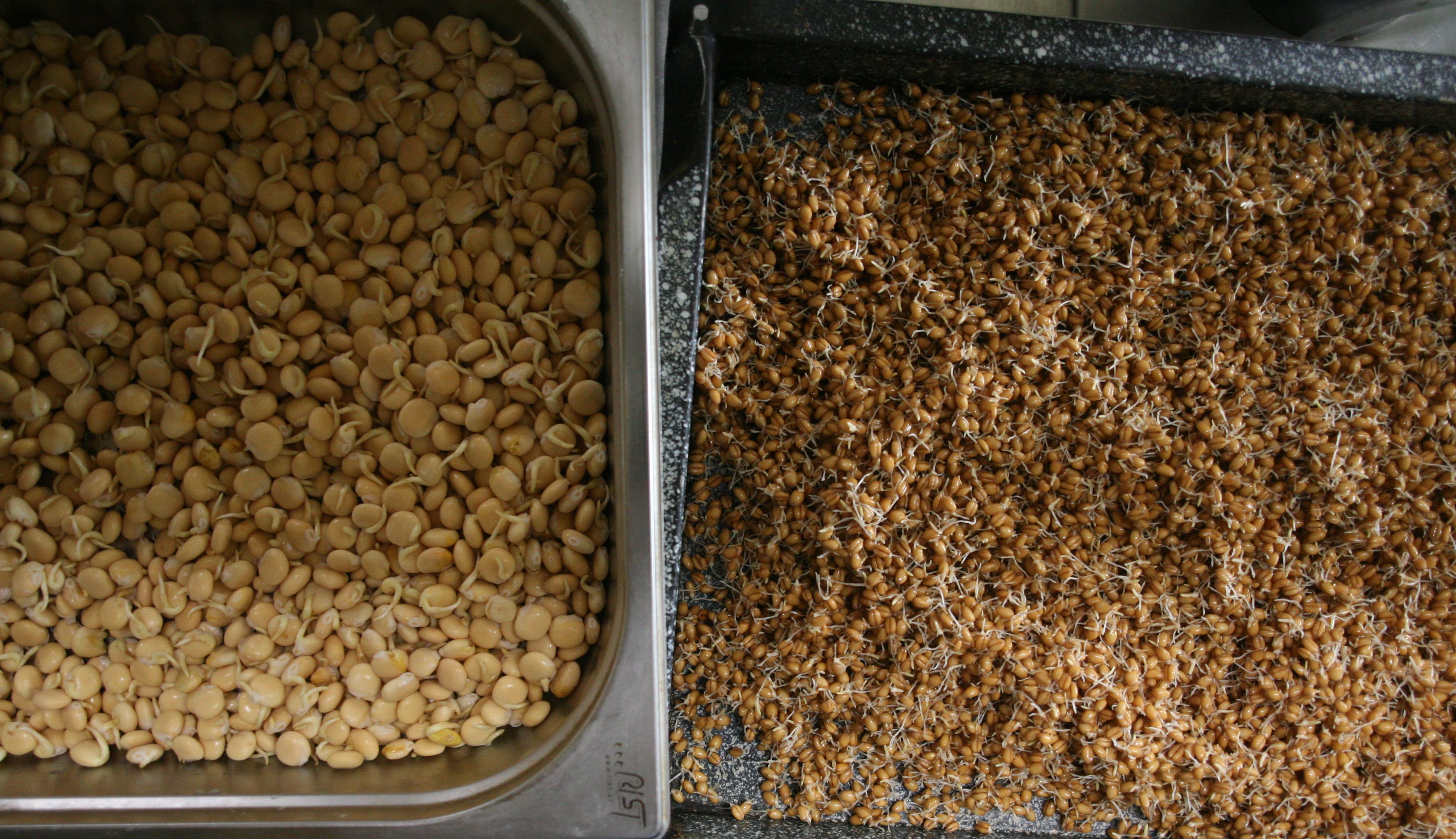 Genauso, wie Sojasauce zu einem Teil aus Weizen besteht, setzt auch der Herr Troißinger auf eine Mischung aus Lupinen und Weizen. Zuerst werden die Bohnen und das Getreide für drei Tage in ein Keimrad gepackt. Das Ding ist eigentlich entwickelt worden, um damit Getreide für Hühnerfutter keimen zu lassen, es funktioniert aber auch für die Lupinen tadellos.