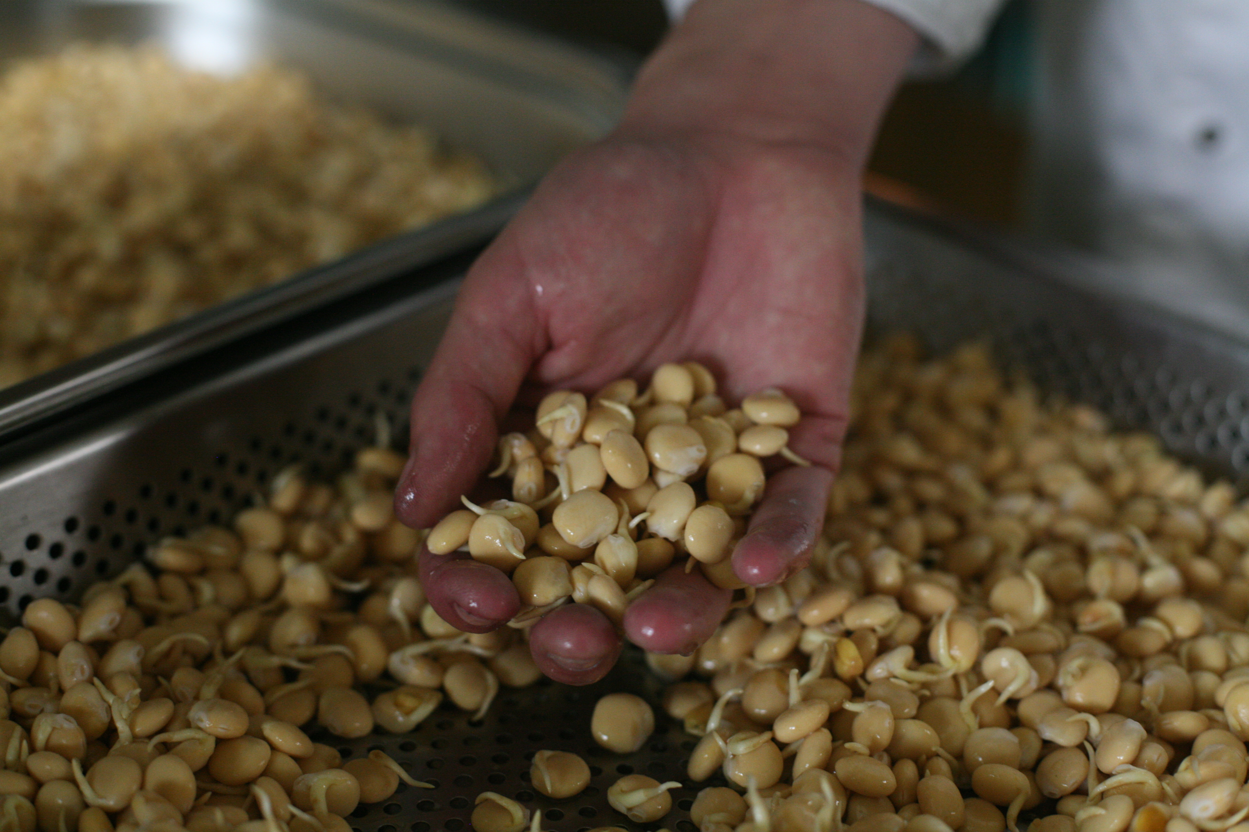 Das Wasser darin weicht die Bohnen auf, wenn sie zu keimen beginnen, verwandeln sie ihre eigene Stärke in Zucker – ein Prozess, der für die spätere Saucenproduktion wichtig ist. Anschließend werden die gekeimten Körner 45 Minuten gedämpft, bis sie einigermaßen al dente gekocht sind und leicht nussig schmecken.