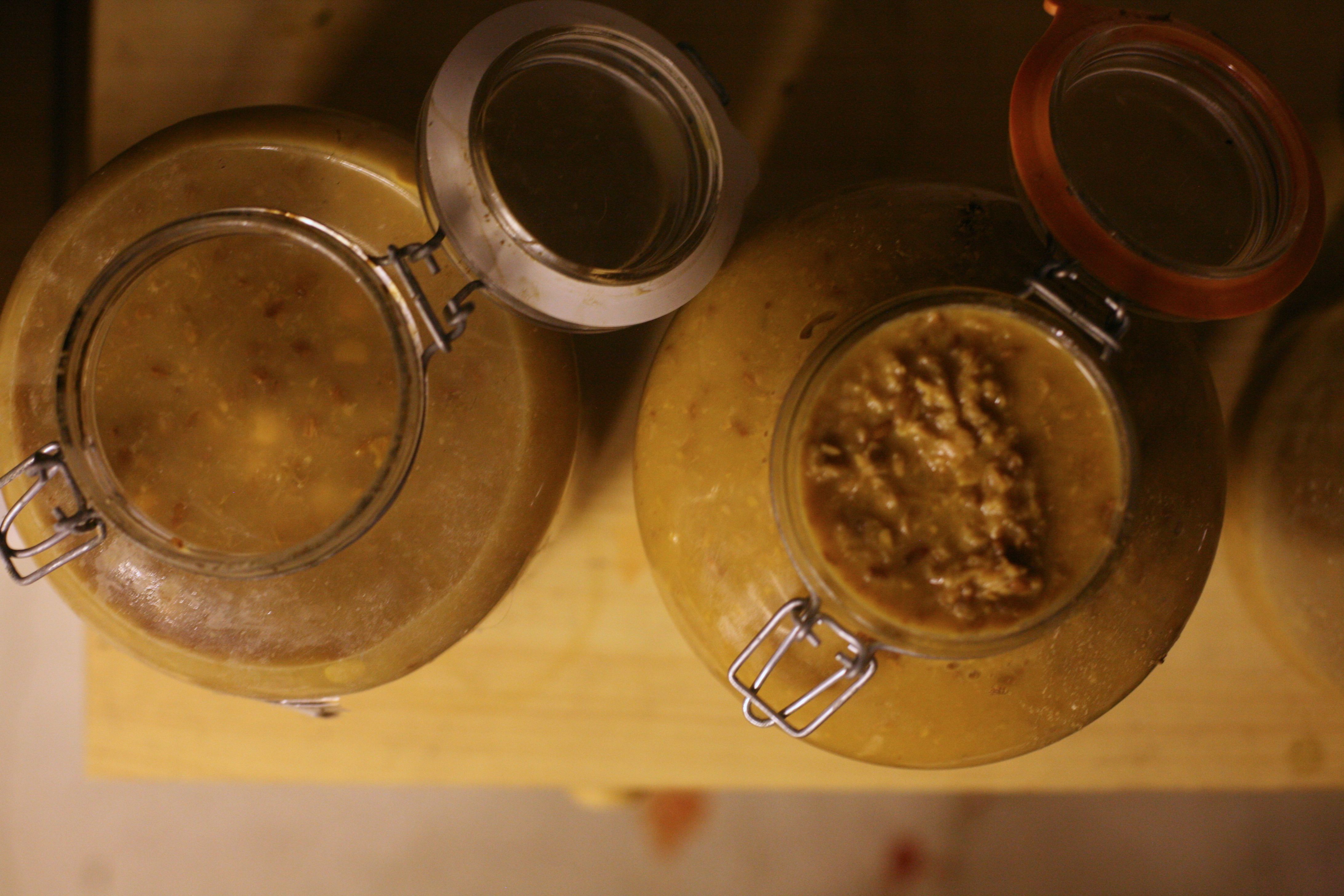 Danach wird die Masse mit einer etwa 15-prozentigen Salzlake gemischt, auf sechs Teile Lupinen/Weizen kommen vier Teile Lake. Schließlich darf alles in Gärgläsern mindestens sechs Monate und bis zu 18 Monate gären.