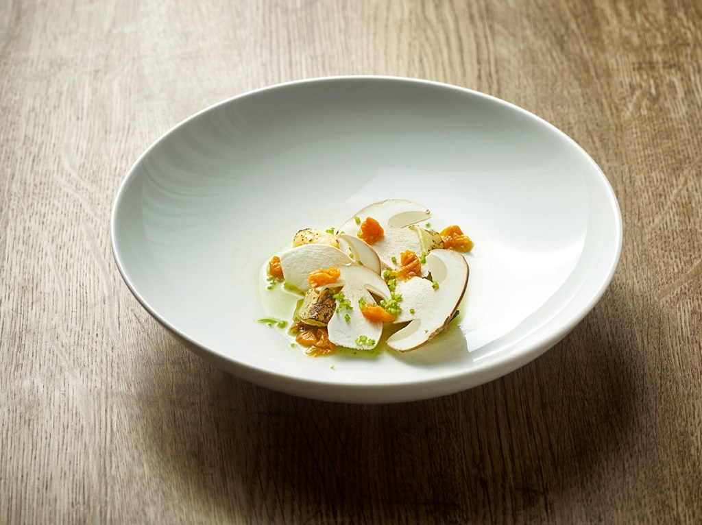 Meine nächster Deutschlandtrip geht nach Nürnberg. Neben der Steckrübe waren die Gerichte des Sosein für mich die beiden Highlights des Tages und zwei der besten Speisen, die ich 2016 gegessen habe. Was sicher auch daran liegt, dass ich Pilzen hilflos verfallen bin. Der Herr Schneider hat gleich eine ganze Kiste mit gut über zehn verschiedenen, selbst gesammelten Schwammerln mitgebracht, von relativ gewöhnlichem wie Steinpilze und Totentrompeten über Baumschwämme wie Krause Glucken bis hin zu so interessanten Dingen wie einem winzigen, dafür aber sehr scharfem Täubing – eine spannende Chili-Alternative, weil die Schärfe dann doch anders schmeckt.